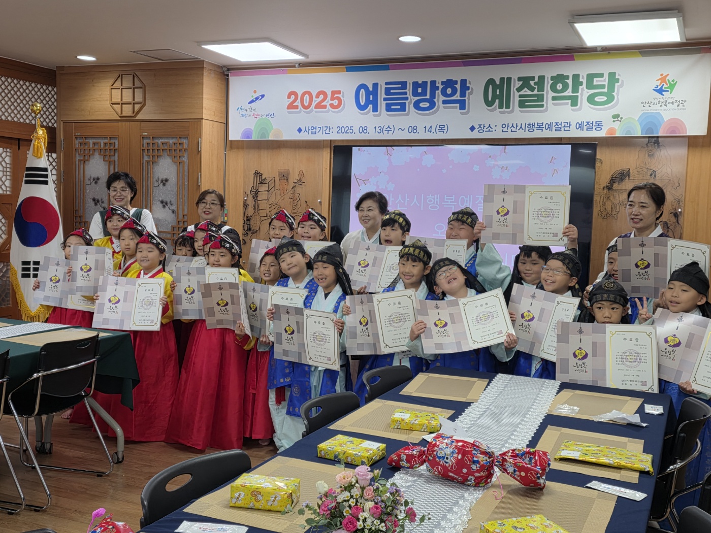 2025년 여름방학예절학당 8월13일(수)과 14일(목) 여름방학을 맞아 인성과 예절을 갖춘 건강한 청소년 문화를 조성하고자 진행된 여름방학예절학당이 성황리에 마무리했다. 한복체험을 통해 전통의 멋을 느끼고, 다도체험으로 차를 우려내며 차분한 마음가짐과 예절을 배웠다. 또한 사자소학,, 밥상머리 교육과 식사예절로 일상 속 바른 인성을 기르는 뜻깊은 시간이었다. 신나는 물놀이와 보물찾기 활동을 통해 친구들과 협동심과 즐거움을 나누며, 전통과 현대가 조화를 이루는 소중한 체험이 되었다. 이번 예절학당은 겨울방학에도 진행될 예정이오니, 미래 인재로 성장할 우리 아이들을 위한 인성‧예절교육에 많은 관심과 참여 부탁드립니다!
